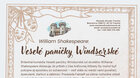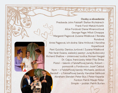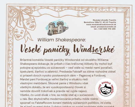 Brilantná komédia Veselé paničky Windsorské od skvelého Williama Shakespeara dokazuje, že príbeh z čias kráľovnej Alžbety by mohol byť pokojne aj epizódou zo súčasnosti – veď stále sú medzi nami povaľači, špekulanti, žiarlivci a záletníci. Predseda Falstaff sa zištne rozhodne získať si priazeň dvoch vysoko postavených dám – Pageovej a Fordovej. Manžel pani Fordovej je veľmi žiarlivý a situáciu rieši vlastnými metódami. Šikovné panie z Windsoru však všetkým dokážu, že ani vysokopostavený človek si nemôže dovoliť čokoľvek a pravda raz vyjde najavo. Všetko, čo uvidí divák v hre, sa môže stať aj v súčasnosti u nás. Bez zbytočného modernizovania príbehu môže niekto spoznať vo Falstaffovom konaní metódy súčasných politikov, iní zistia, že aj keď sa mení doba, ľudstvo ostáva vo svojej podstate stále rovnaké. Nevšedné historizujúce kostýmy pôsobia nadčasovo – pripomínajú nám obdobie, v ktorom bola hra napísaná, no zároveň na nich pozorujeme jasné kontúry súčasnej módy, čo odkazuje na aktuálnosť témy.